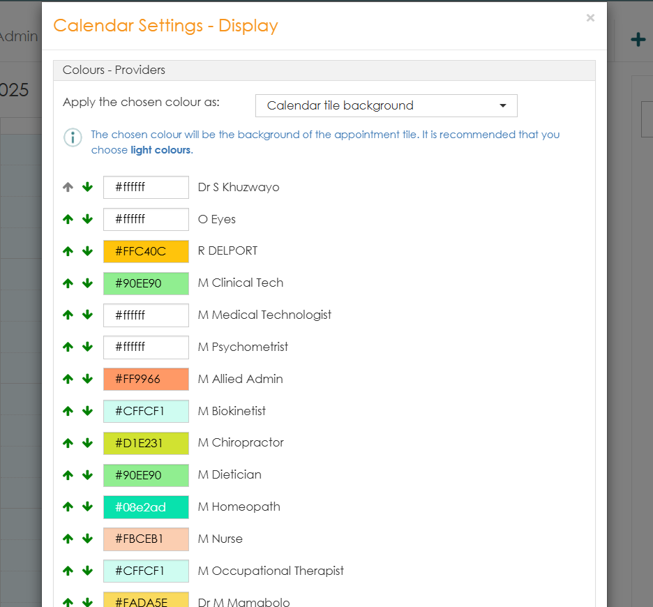 - In the top section of the window, ‘Colours - Providers’, you are able to select the colour that you would like for the provider tile or provider highlight as well as reorder how providers are displayed.