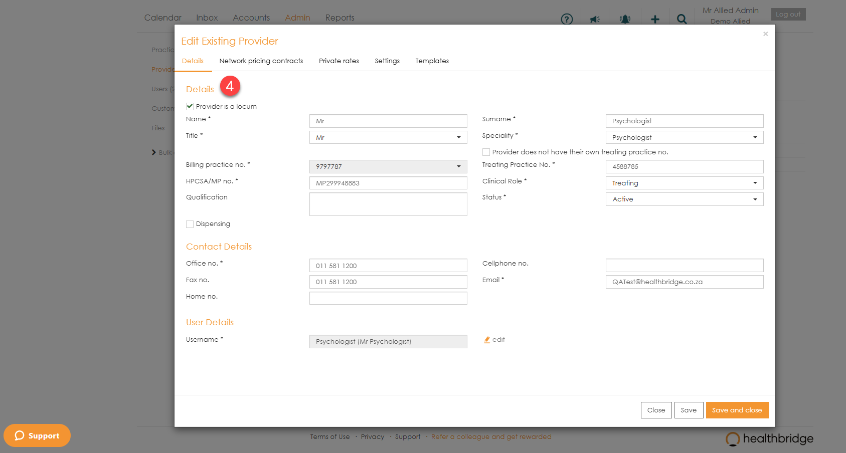 Note: The ‘User Details’ section enables you to link a treating provider to a user. You can either link a provider to an existing user by searching for the username in the ‘Username’ field or add a new user by clicking on the ‘add new user’ link.