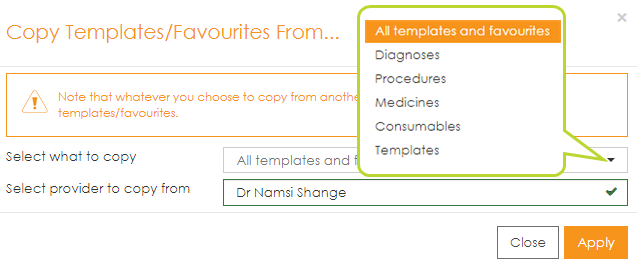 From the pop up screen, select what you would like to copy from the drop down list and then the provider that you would like to copy to.