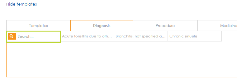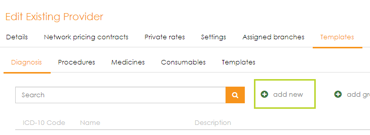 From the provider screen, click the ‘Templates’ tab, these have been divided into sub tabs, namely; Diagnosis, Procedures, Medicines, Consumables and Favourites.