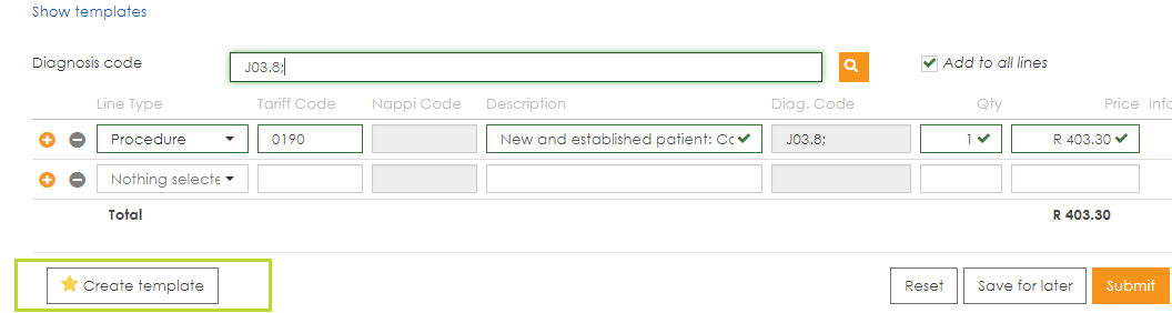 From the ‘Add Template’ screen, you can give the template a custom name and then add the diagnosis, procedure code, any medicine and consumable. This is done similarly to capturing an invoice. The order of the templates is assigned automatically.