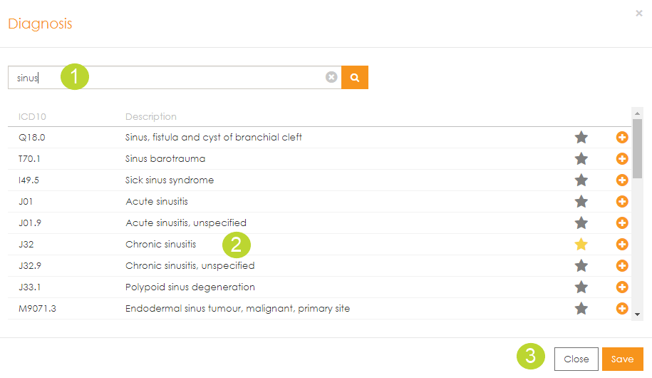- From the populated list, click on the star to add the item as a favourite (an orange star indicates that the item has already been added). This will then open another screen where you can give the template a name and then save.