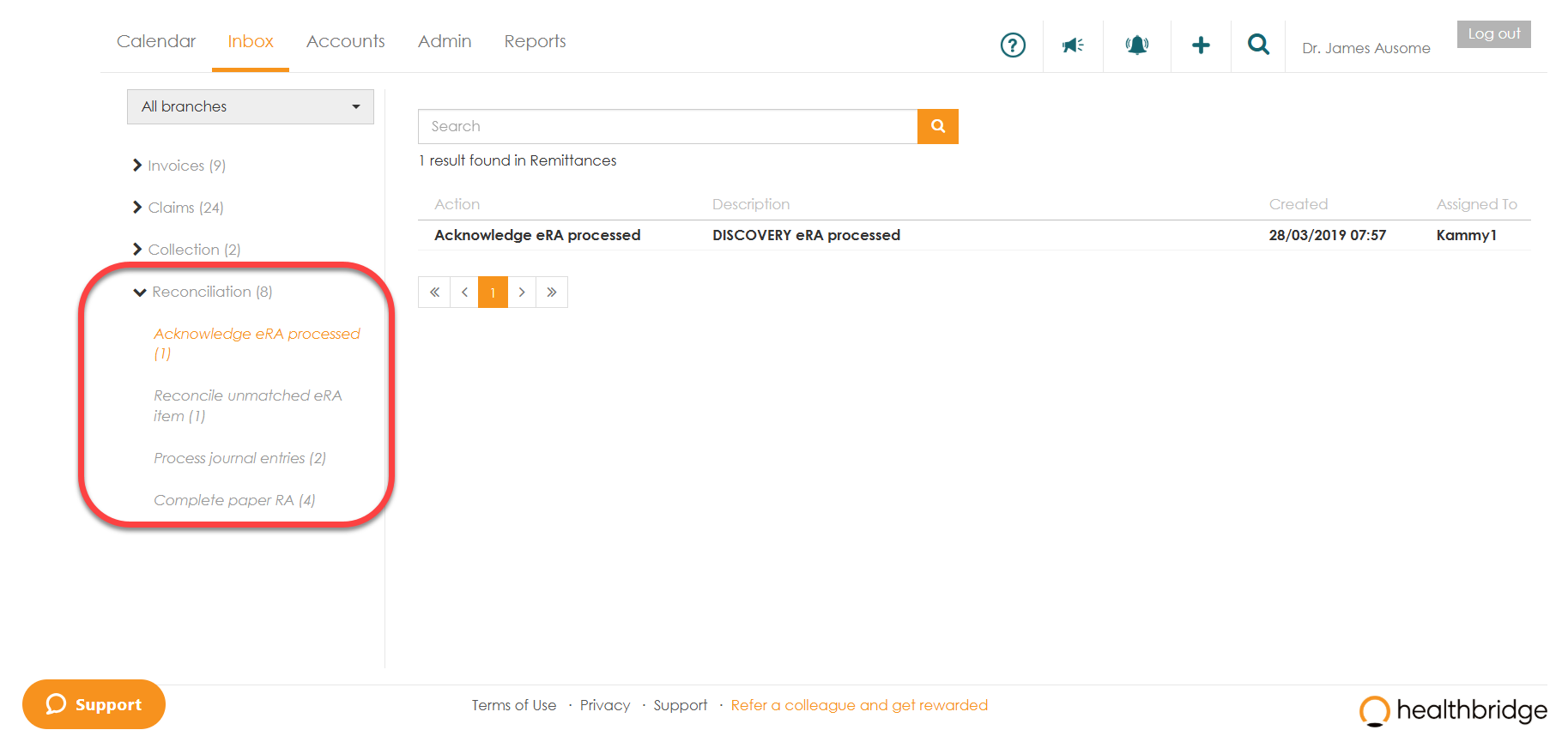 - Matched eRAs are found in the ‘Inbox’ under ‘Acknowledge eRA processed’