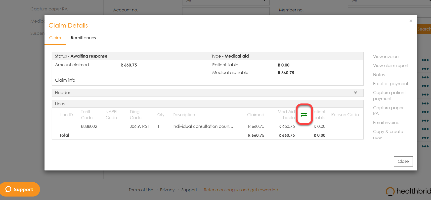 - Select the invoice you would like to transfer the amount for, then click the arrows that are in between ‘Medical Aid Liable’ and ‘Patient Liable’.