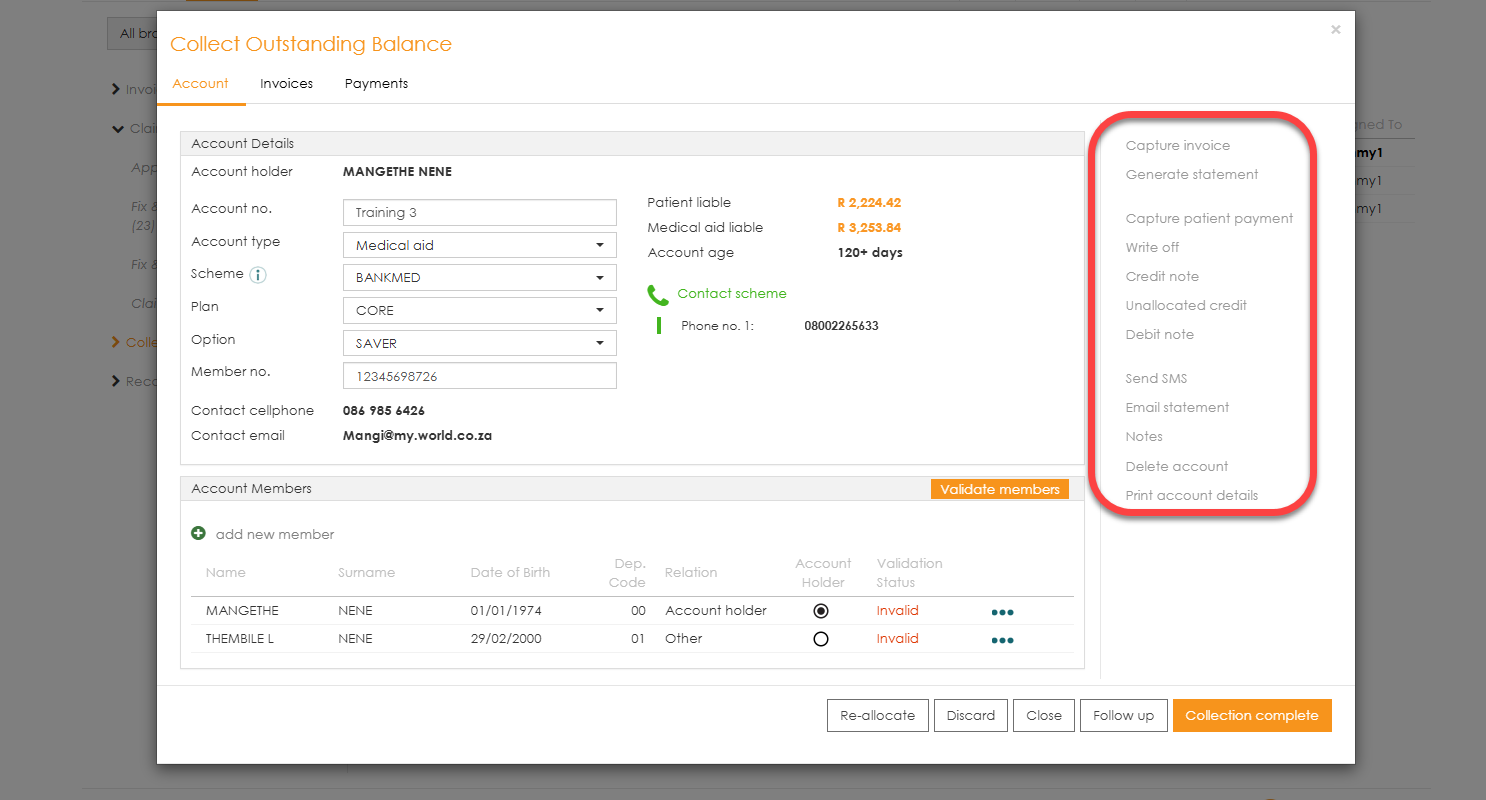 - Select from the different options available for collection such as ‘ Capture patient payment ’, ‘ Credit note ’, ‘ Write off ’, ‘ Send SMS ’, etc.